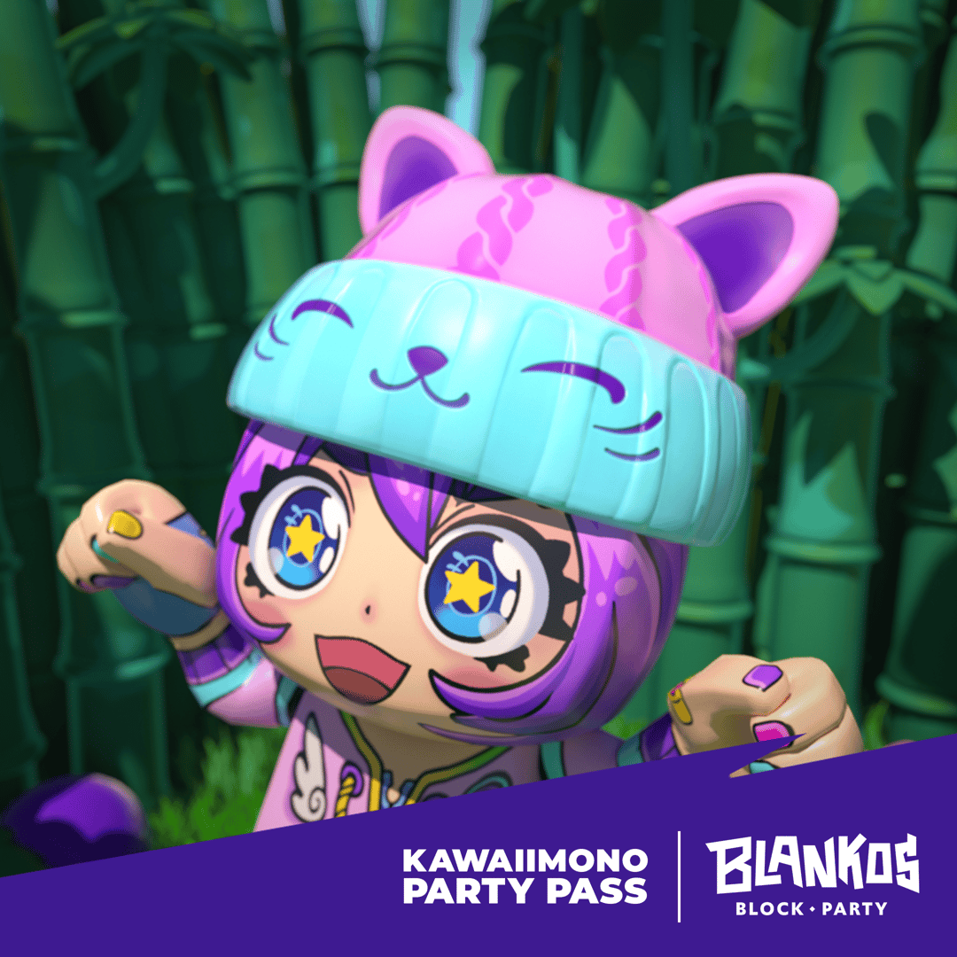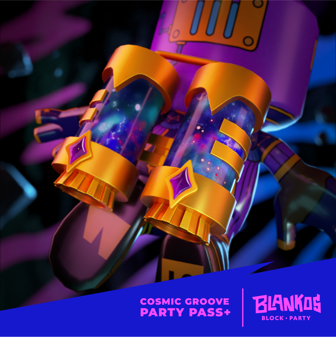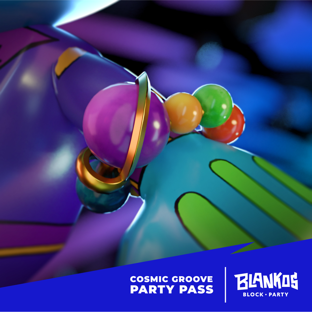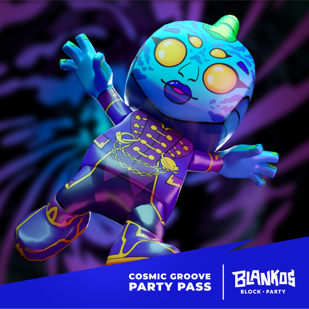 Hero artwork and individual item renders for seasonal Party Passes in Blankos Block Party by Mythical Games.