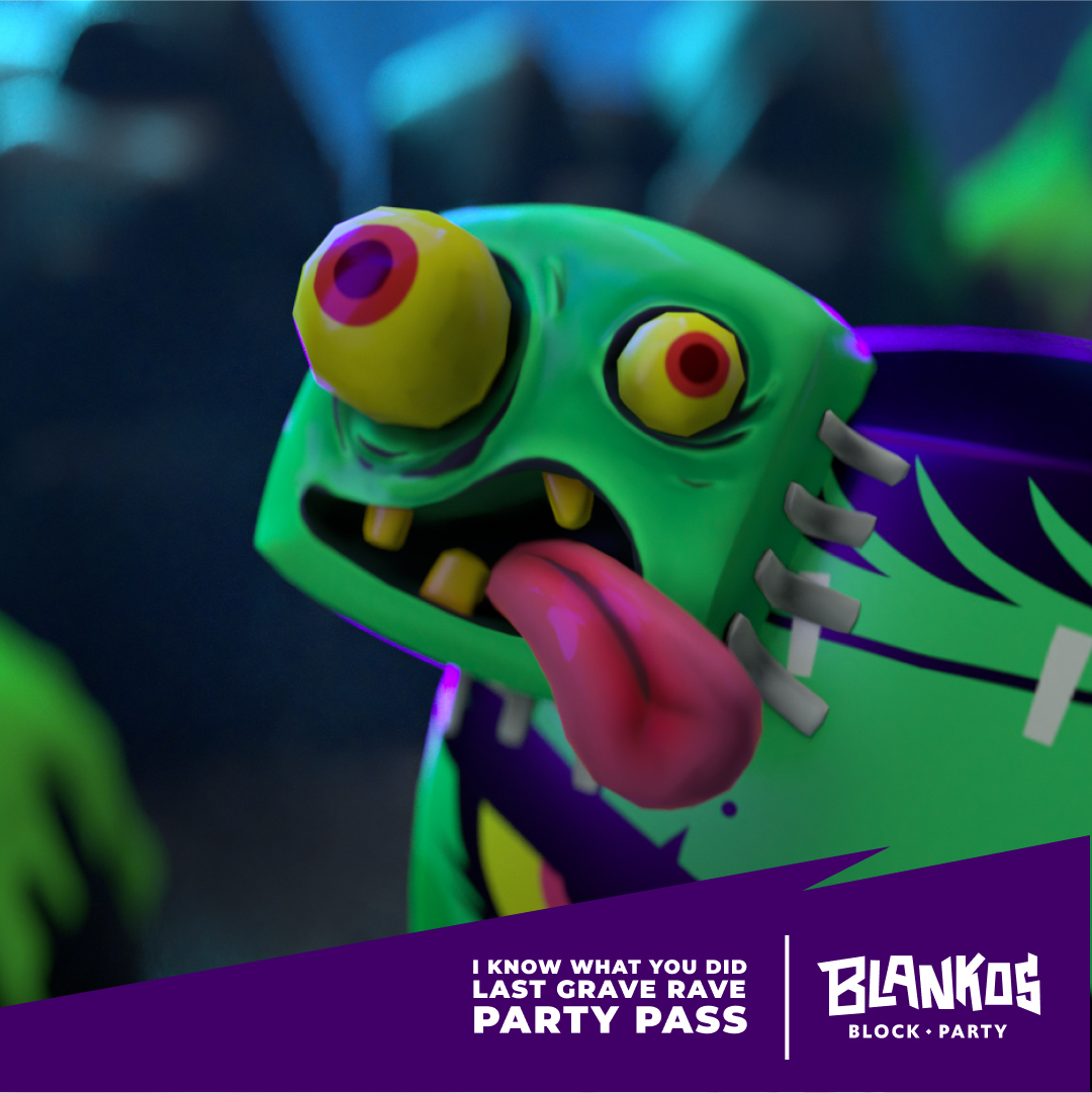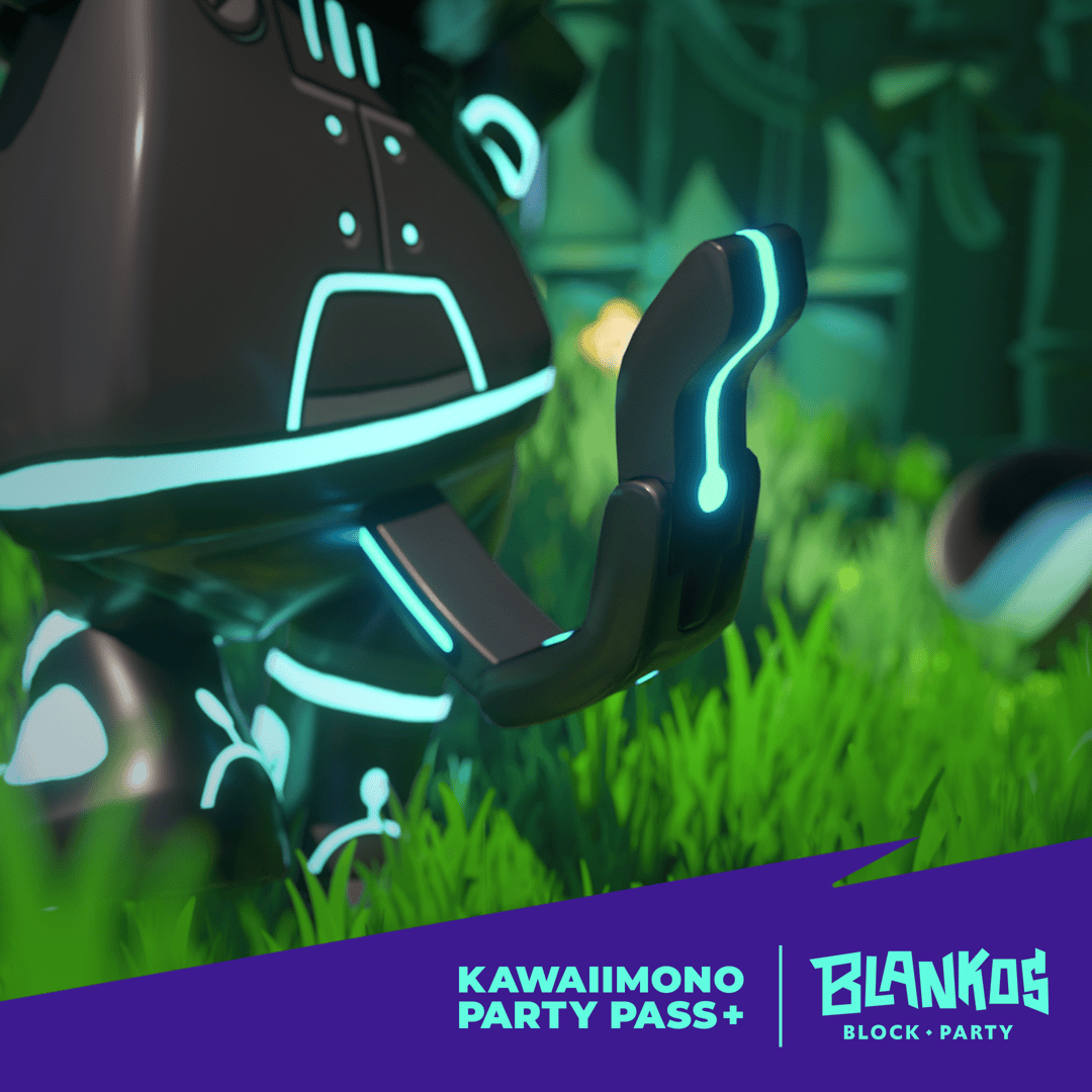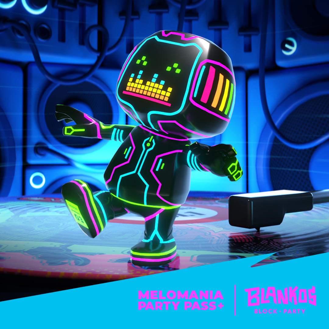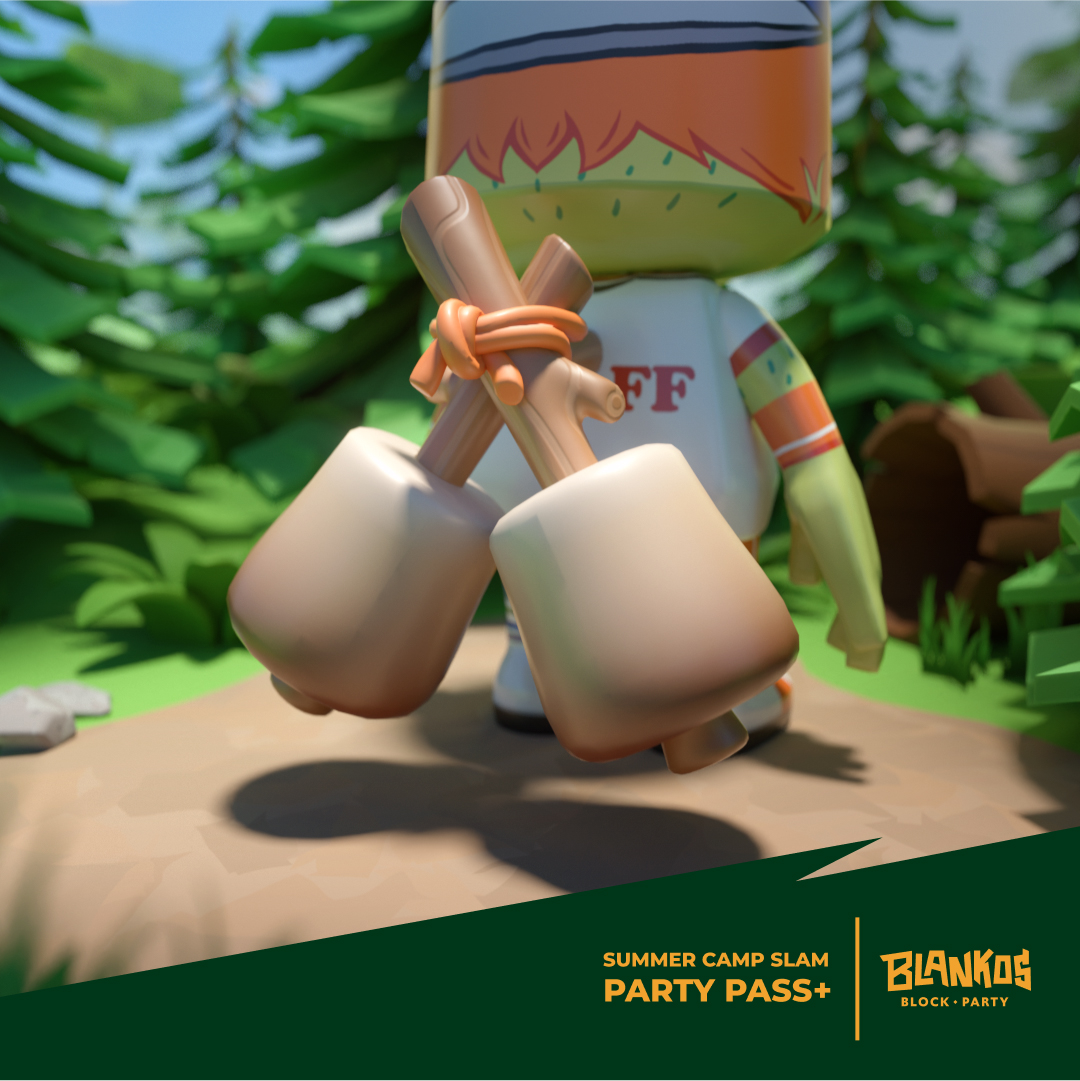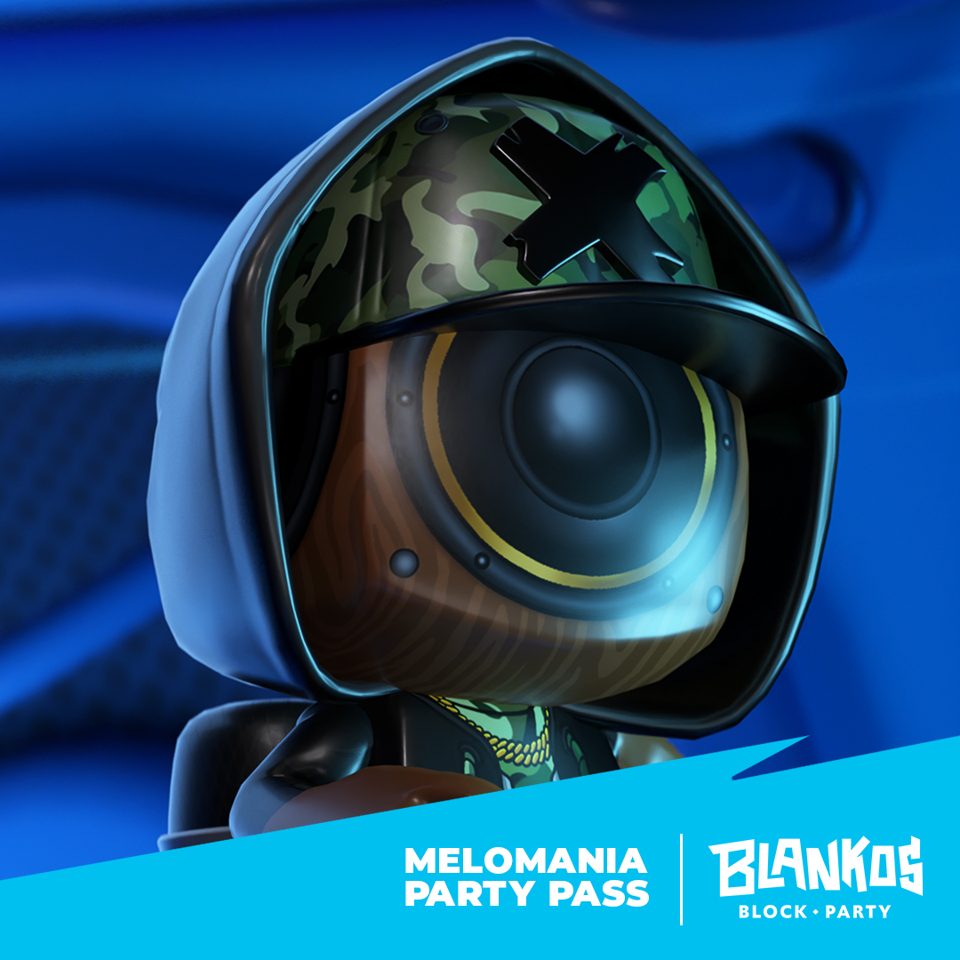 Hero artwork and individual item renders for seasonal Party Passes in Blankos Block Party by Mythical Games.