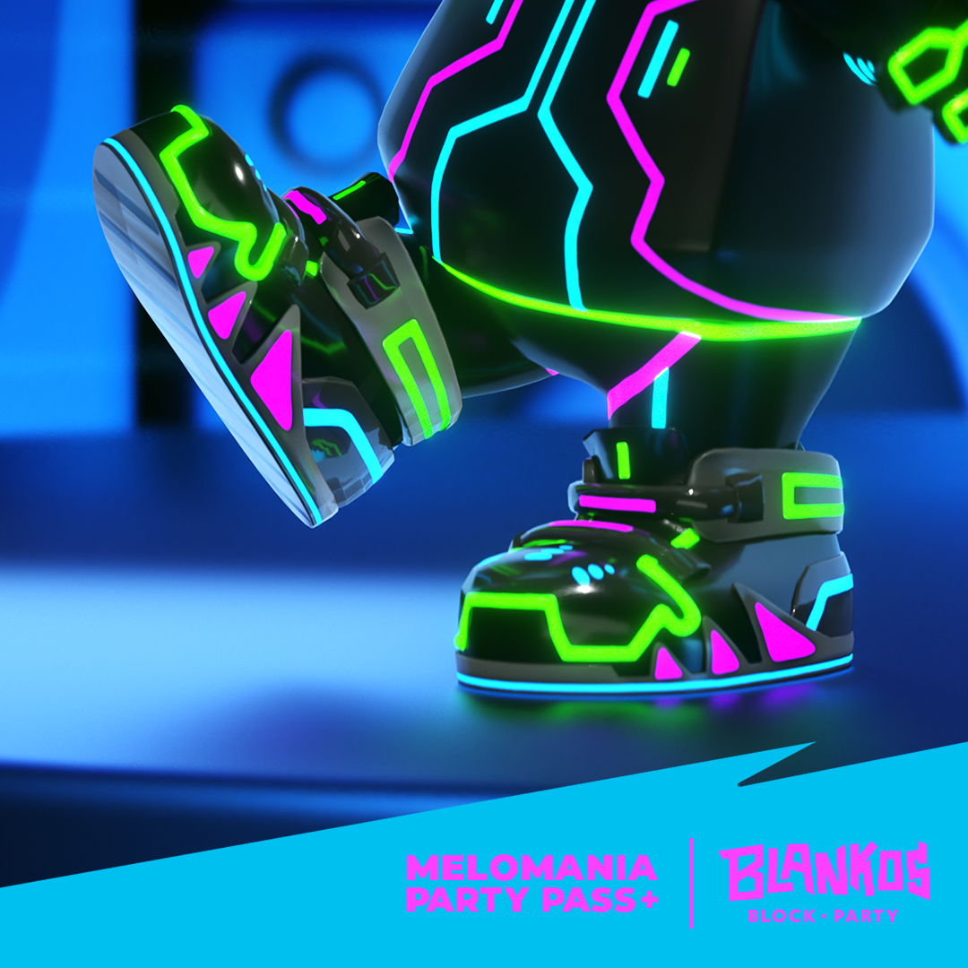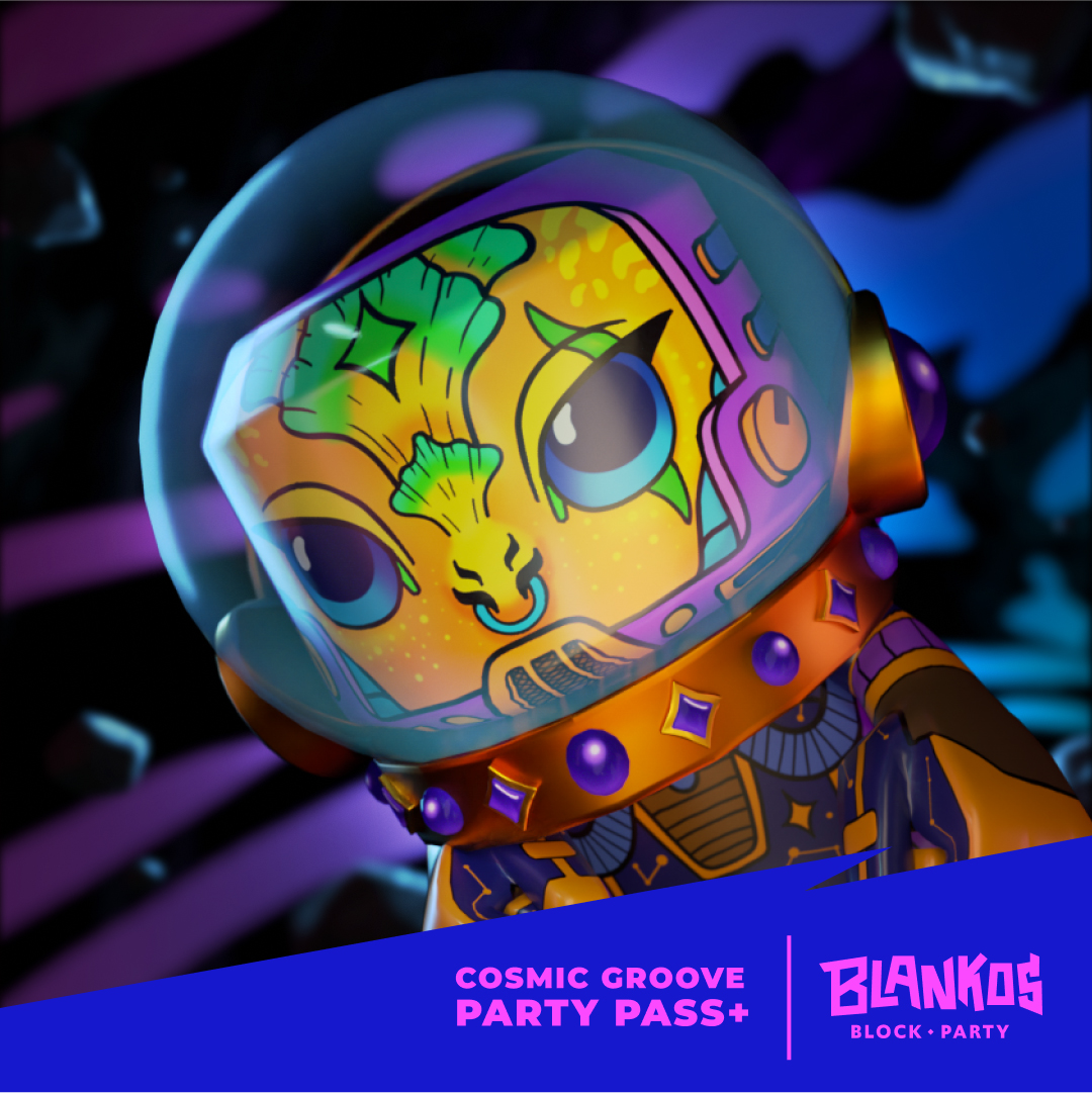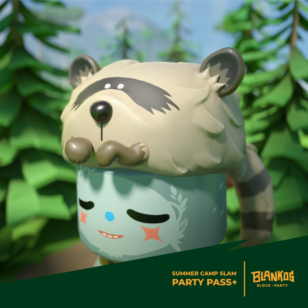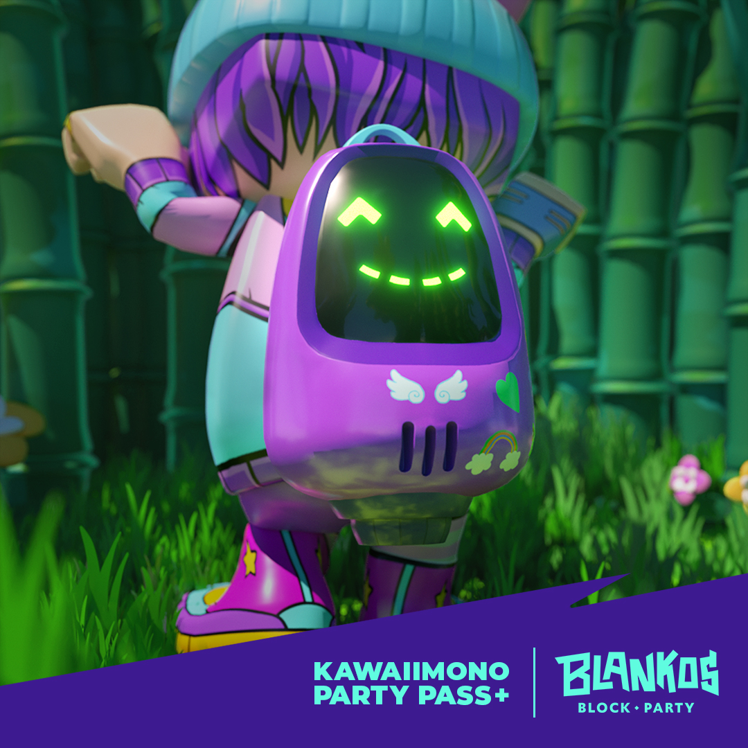 Hero artwork and individual item renders for seasonal Party Passes in Blankos Block Party by Mythical Games.