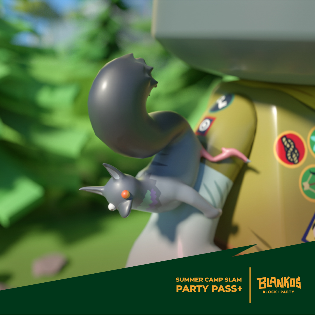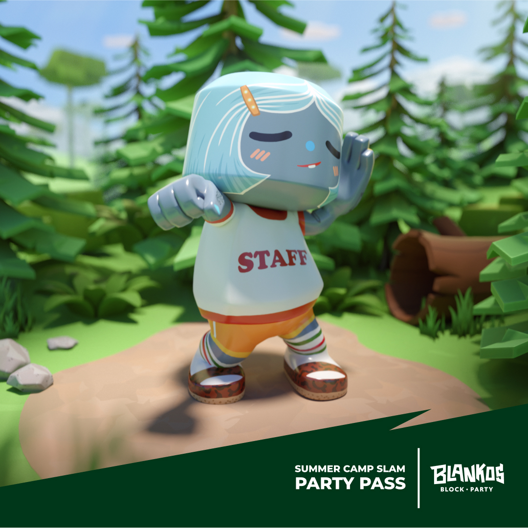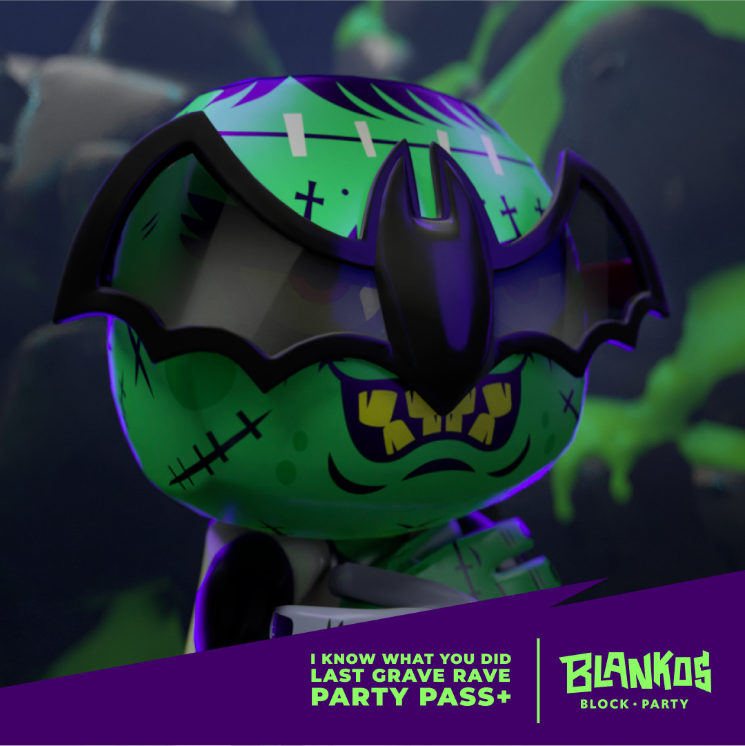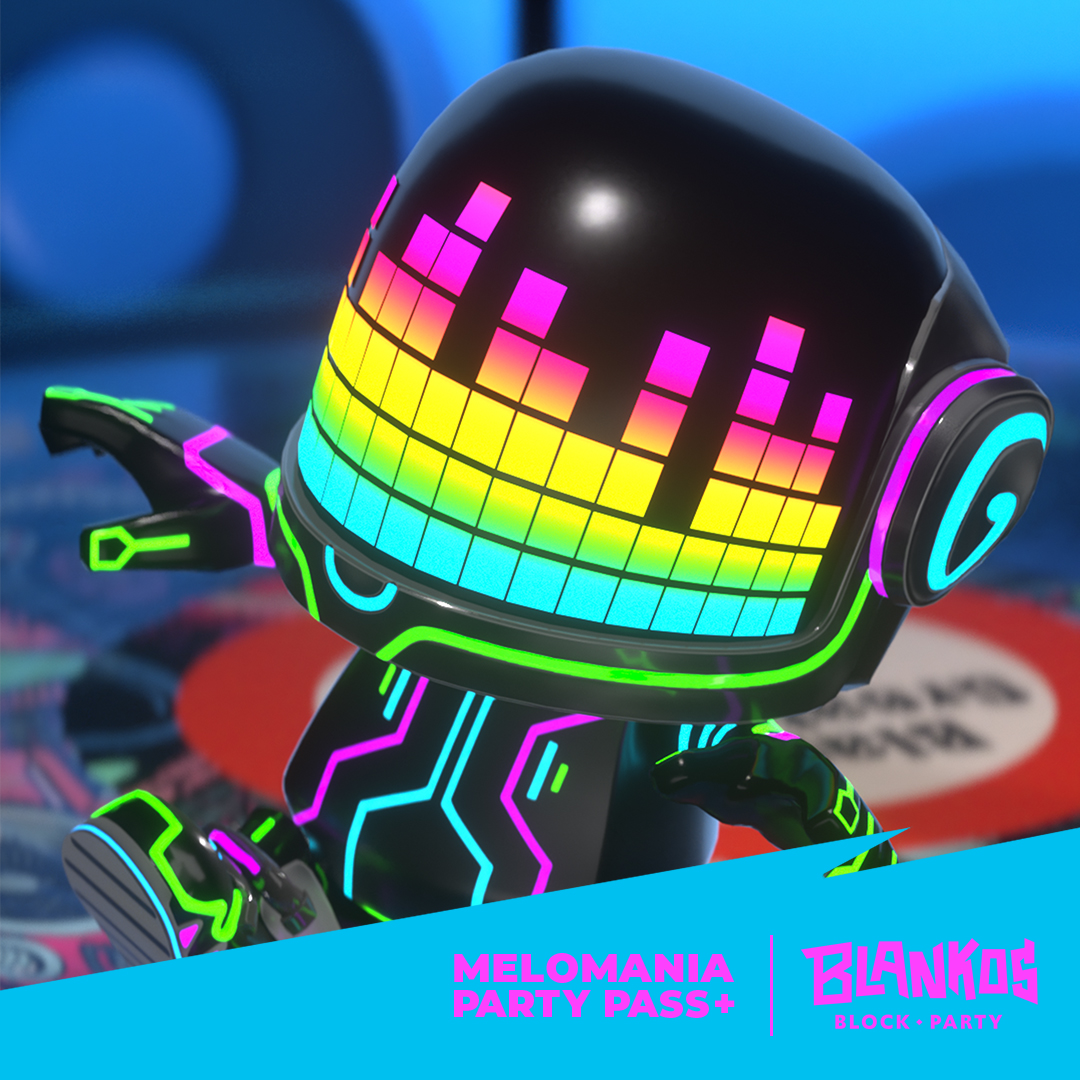 Hero artwork and individual item renders for seasonal Party Passes in Blankos Block Party by Mythical Games.