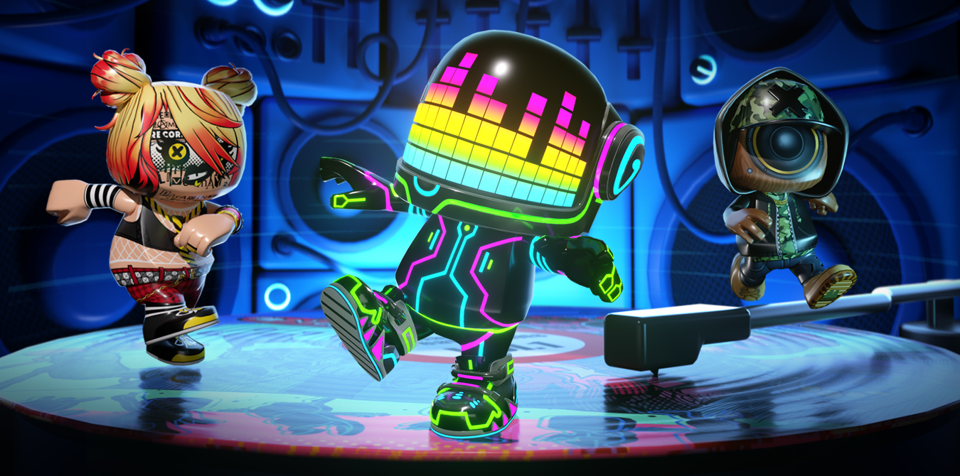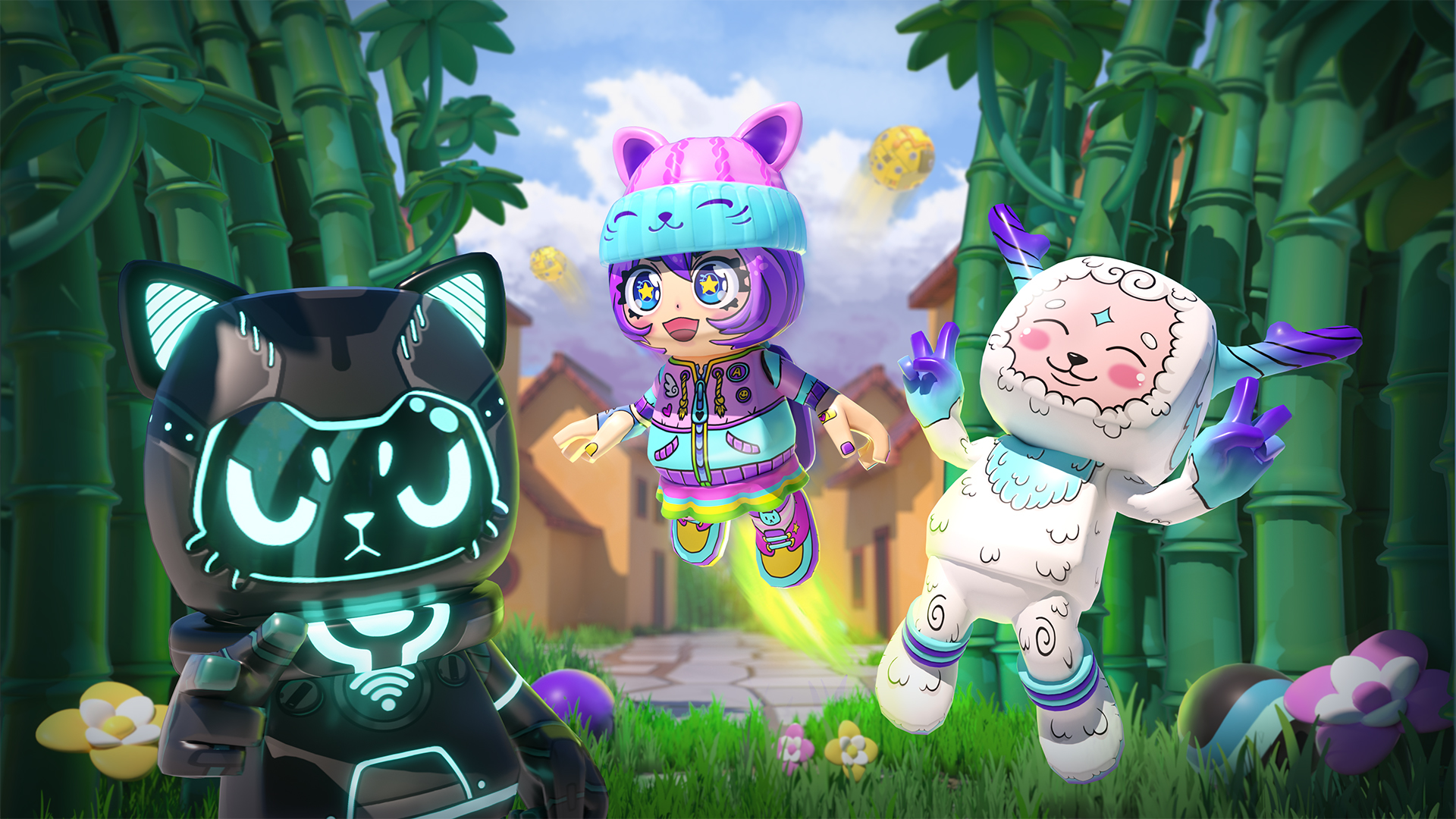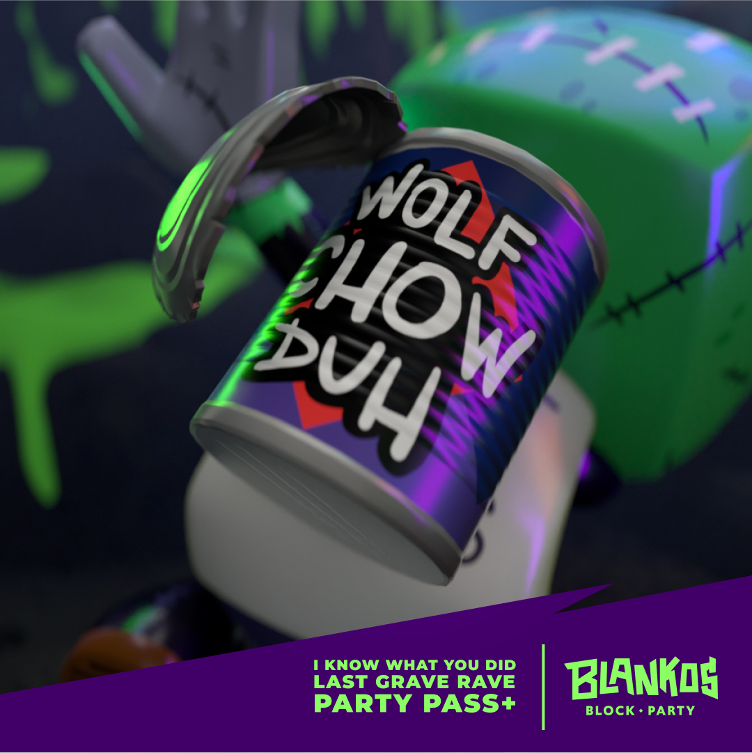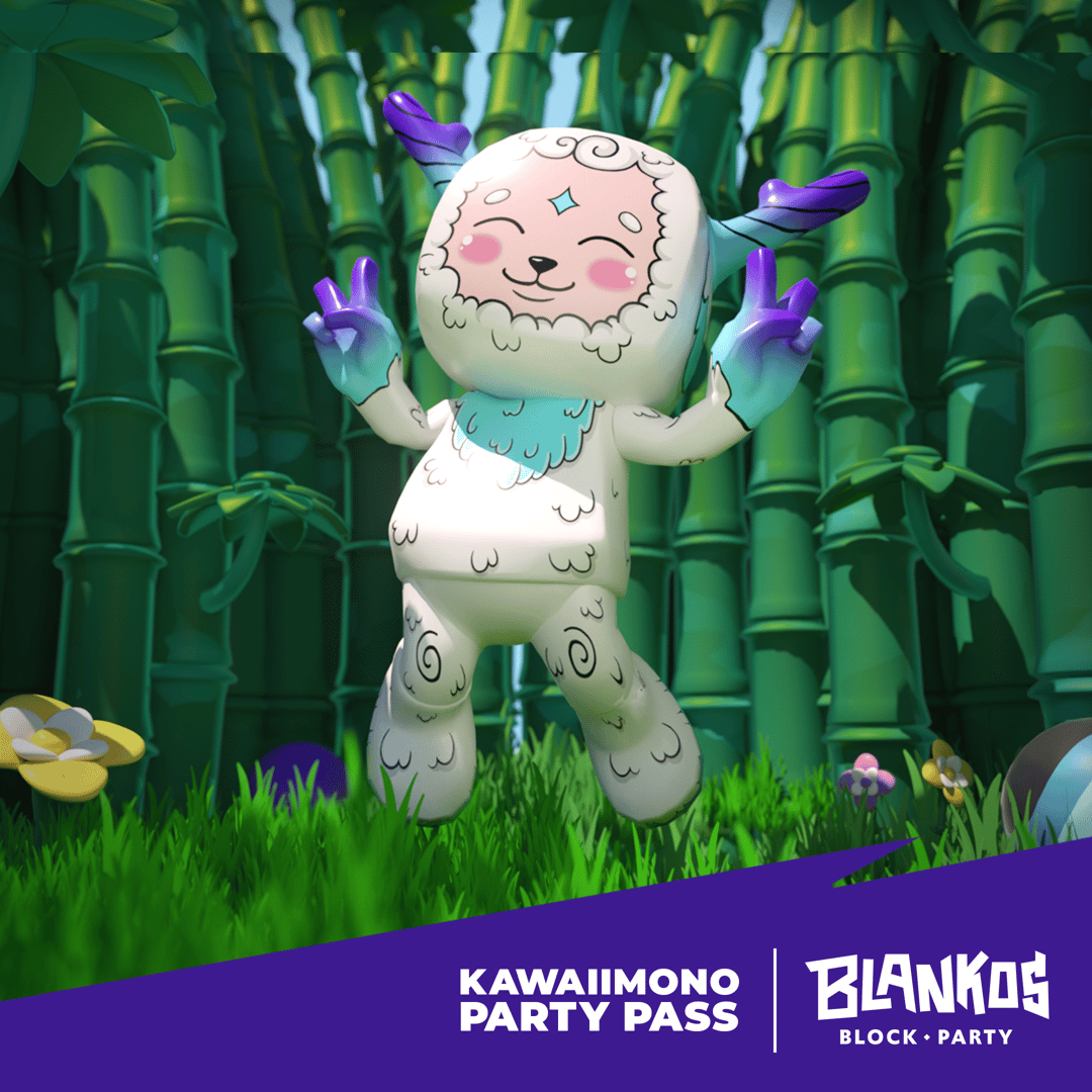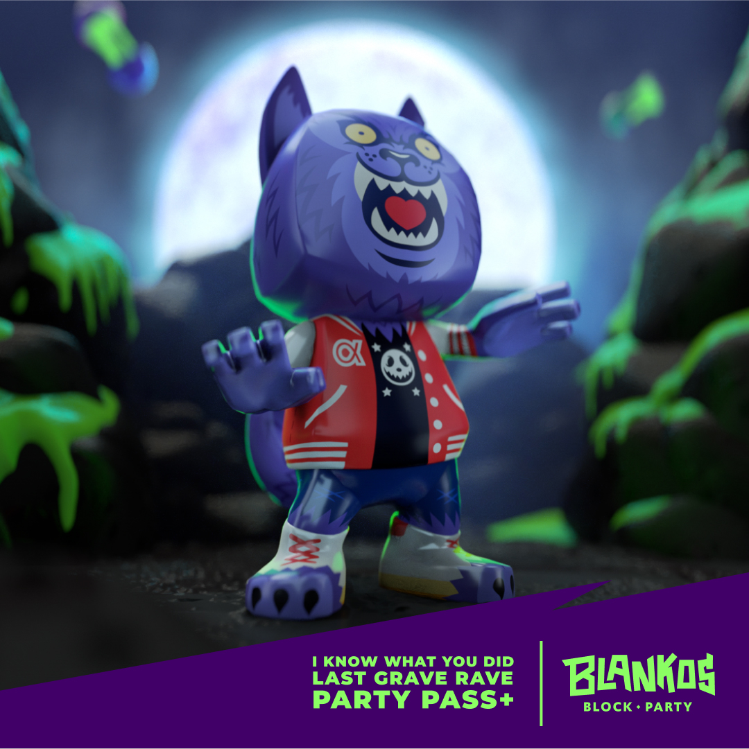 Hero artwork and individual item renders for seasonal Party Passes in Blankos Block Party by Mythical Games.
